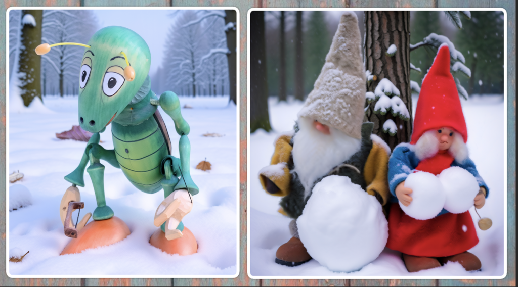 De kabouters vinden het zalig in de sneeuw. Kamiel heeft een grote sneeuwbal gerold en Kaatje twee kleintjes. “Speel je mee Alffartje,” vragen ze samen.