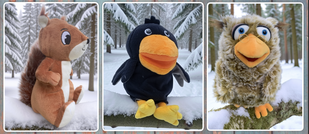 “Wat is hier aan de hand? Ik wil wel gaan slapen hé!” roept Meneer Uil een beetje boos. Hij heeft zijn brilletje op omdat het al dag is en ook omdat de witte sneeuw het heel licht maakt.